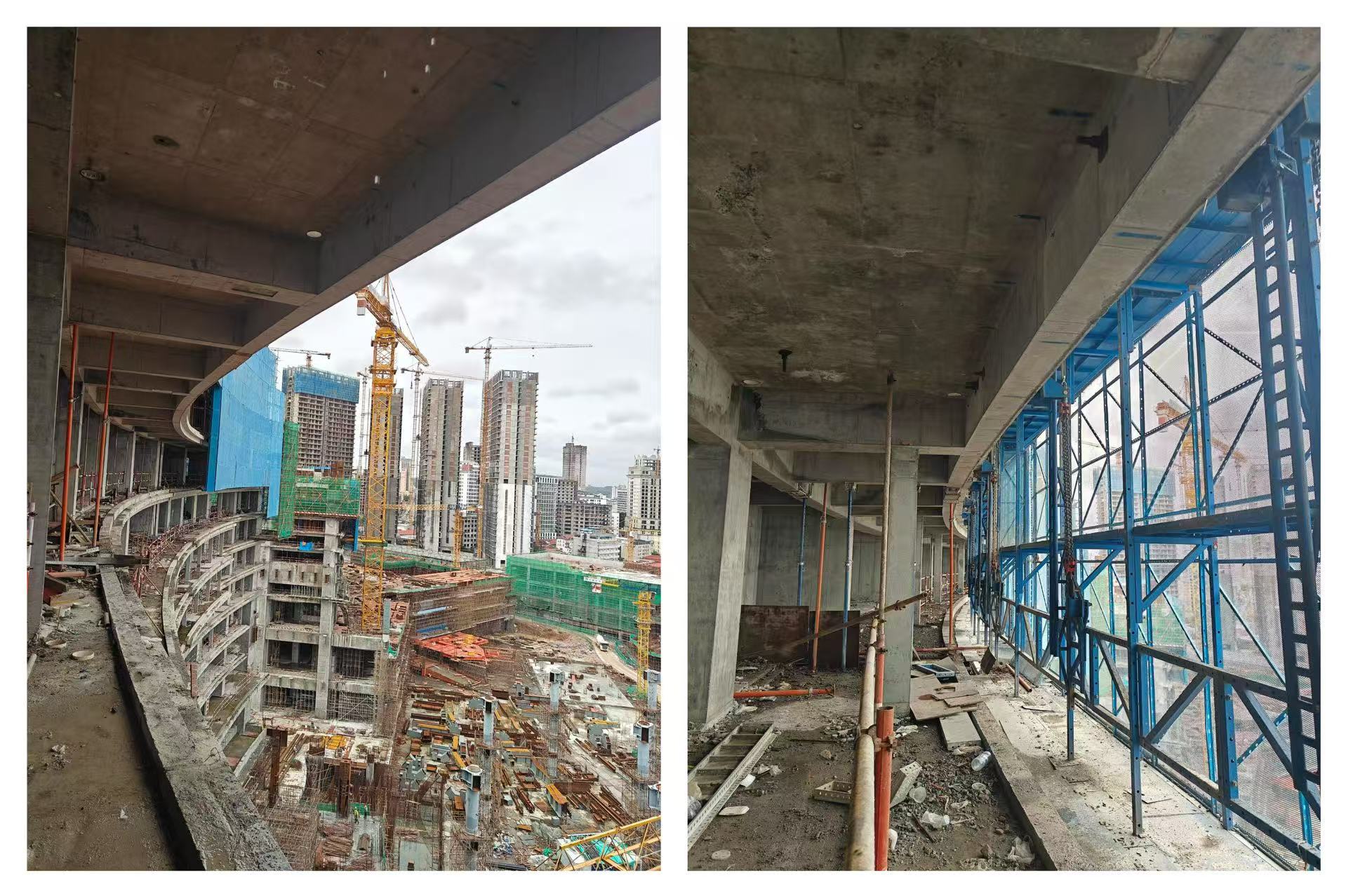 El proyecto consta de dos torres separadas por una junta de dilatación de 450 mm de ancho. Considerando las condiciones de construcción de la obra y la eficiencia operativa, se adoptó una solución de encofrado colgante en la zona de la junta de dilatación, lo que mejoró significativamente la seguridad y la eficiencia en la obra. Para las múltiples secciones de franjas postensadas de la estructura, se instalaron varios conjuntos de encofrado y sistemas de soporte para garantizar que la resistencia del hormigón cumpliera con los estándares de diseño, logrando así tanto la seguridad de la construcción como la calidad estructural.