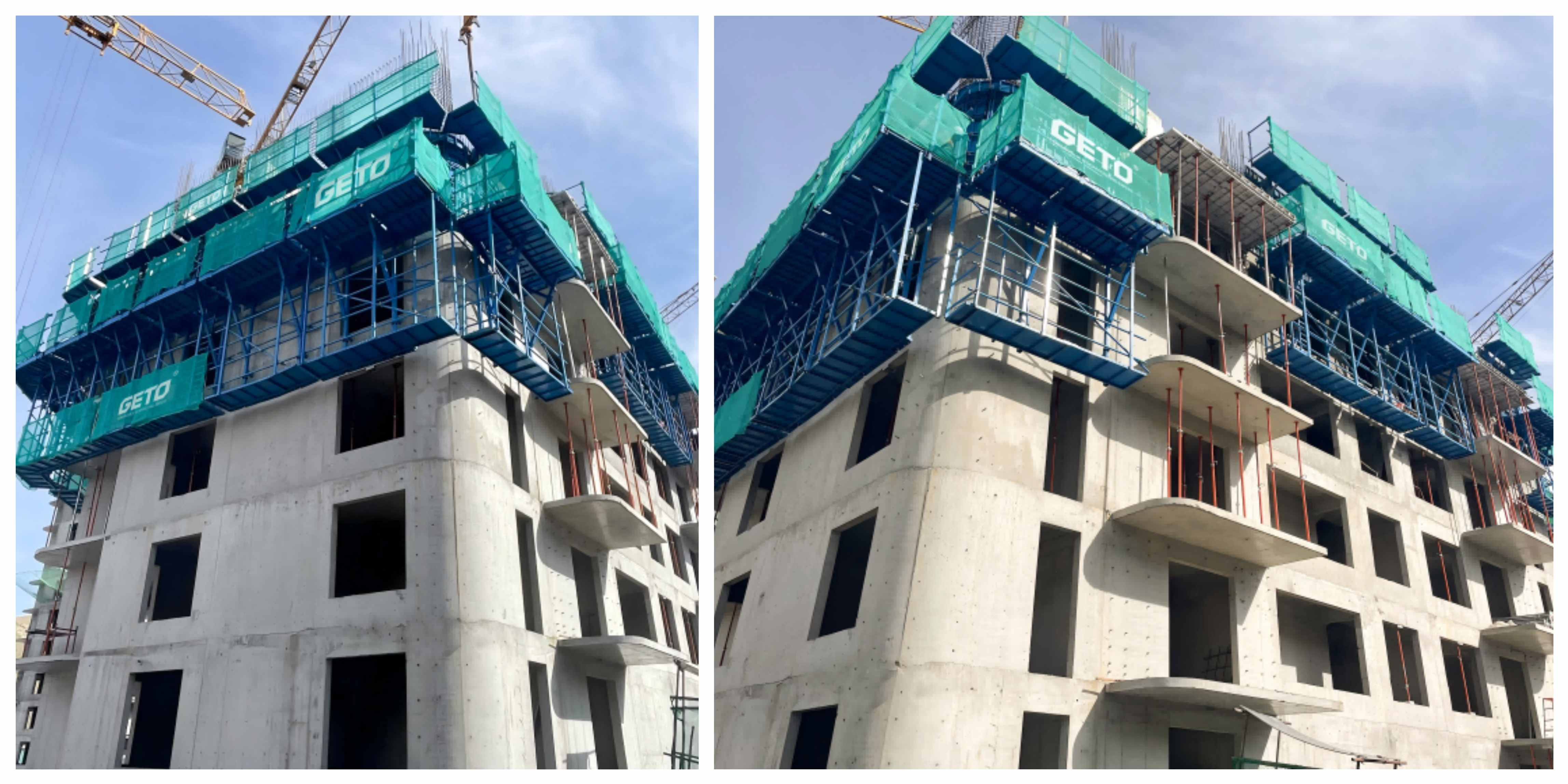 Los muros exteriores del proyecto presentan múltiples aberturas para ventanas, secciones curvas y losas en voladizo, lo que supone un reto para los sistemas de encofrado convencionales, que requieren precisión y flexibilidad. Para abordar estas condiciones, el equipo de ingeniería de GETO proporcionó una solución de encofrado trepante a medida, garantizando la eficiencia constructiva y el control de costes, al tiempo que se mantienen altos estándares de seguridad y calidad.